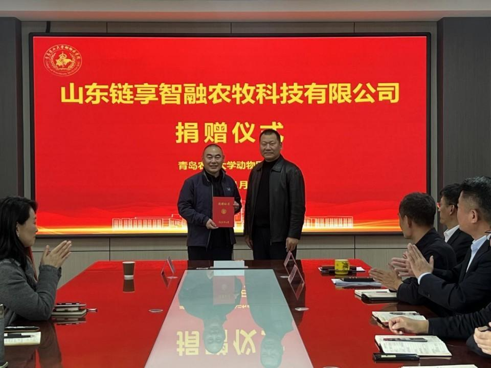 11月13日下午,山东链享智融农牧科技有限公司捐赠仪式在青岛农业大学动物医学院会议室举行。动物医学院党政班子成员、部分教职工参加了捐赠仪式。