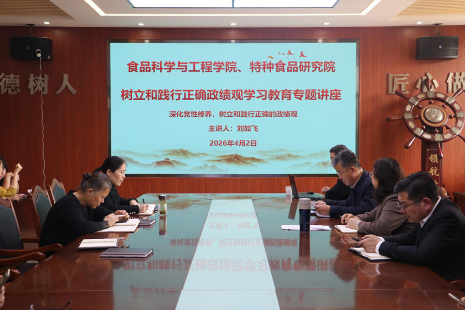 4月2日,食品科学与工程学院、特种食品研究院召开全体教职工理论学习会议,邀请青岛农业大学马克思主义学院刘如飞教授,作树立和践行正确政绩观学习教育专题讲座,会议由学院党委书记车广杰主持,全体教职工参加。