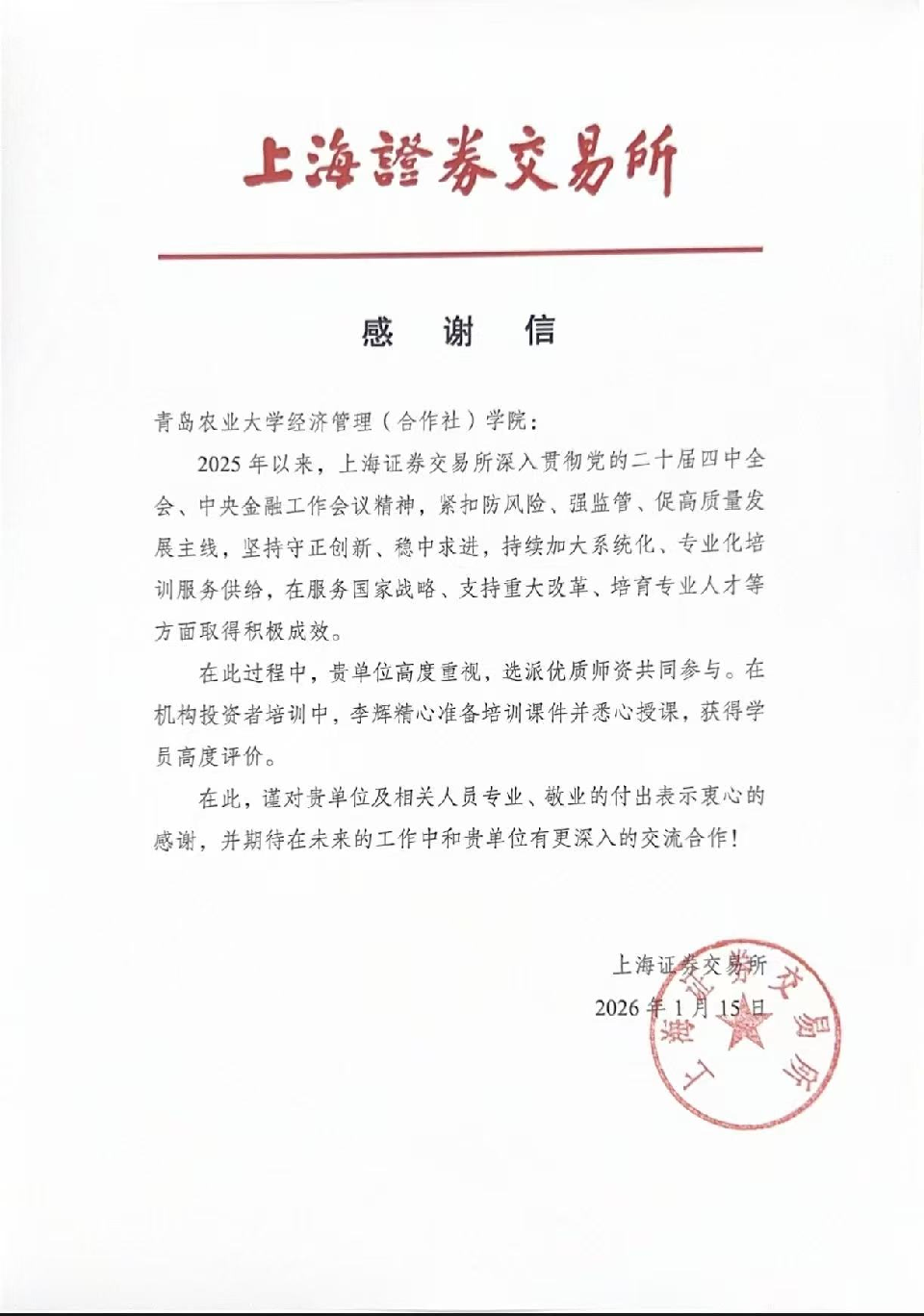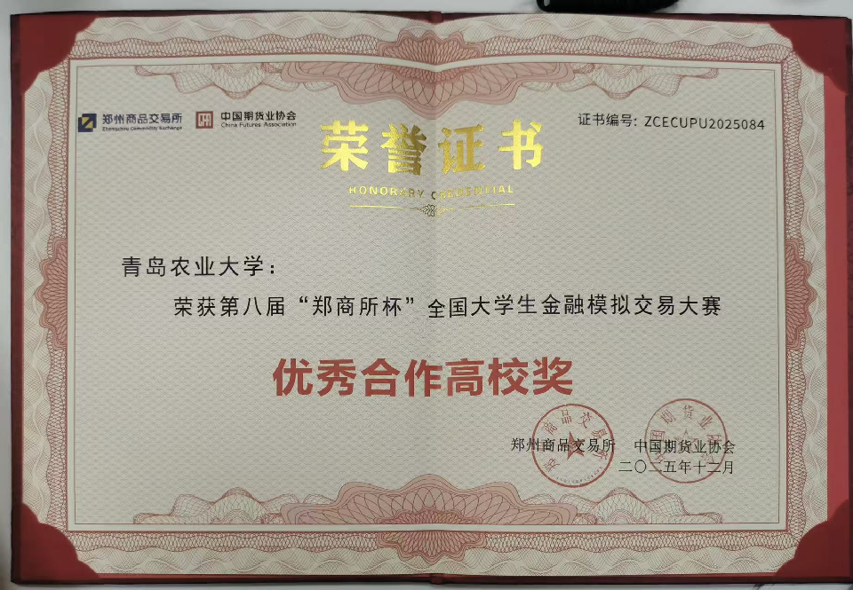 近年来,经济管理学院(合作社学院)在金融服务“三农”领域成效显著,凭借涉农金融创新、期货赋能乡村振兴等扎实实践,助力学院获上海证券交易所表扬信及学校获中国期货业协会“优秀合作高校”称号,标志着我校金融学科服务乡村振兴能力迈上新台阶。
