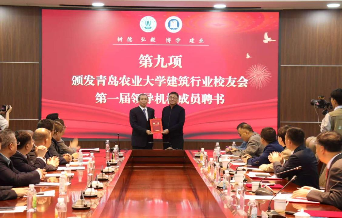 与会人员共同审议《青岛农业大学建筑行业校友会章程(草案)》等章程,推选出建筑行业校友会领导机构成员并颁发聘书。