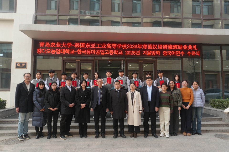1月15日,青岛农业大学-韩国东亚工业高等学校2026年寒假汉语研修班结业典礼在博学楼会议室举行。青岛农业大学党委委员、副校长王永健,韩国东亚工业高等学校校长李京焕出席典礼,典礼由国际合作交流处处长吴薇主持。
