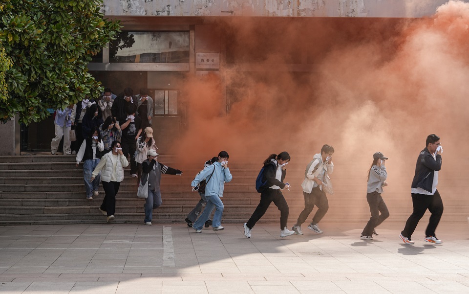 本届校园安全文化节活动涵盖五个篇章30项活动内容,包括安全教育情景剧、文创作品、主题宣讲等多元形式,贯穿全年、分层分类、全员覆盖。活动现场开展了应急疏散演练。演练模拟教学楼A区突发火情,学校随即启动应急预案,依次开展初起火灾处置、人员紧急疏散、报警求援等流程,城阳区消防救援局迅速到场协同处置。7个专项工作组、200余名学生全程参与演练,在实战化场景中掌握火场逃生技能。