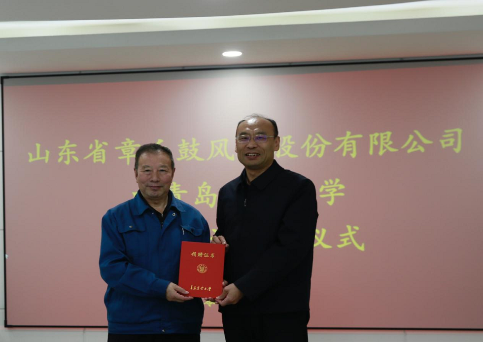 仪式上,孟晓军代表学校向方润刚颁发捐赠证书。机电工程学院党委书记吕玉亭与山东省章丘鼓风机股份有限公司技术副总监刘飞签订捐赠协议。