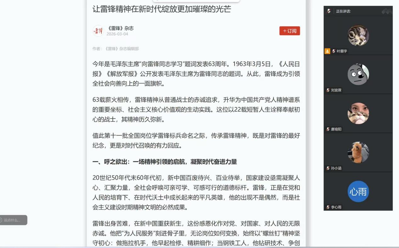 全校各基层团支部紧扣活动主题,全面开展“青春聚力兴三农,志愿笃行学雷锋”专题主题团课,依托“学习强国”等优质教育载体,组织团员集中观看雷锋事迹纪录片、研读雷锋日记,系统学习新时代雷锋精神的核心内涵与时代价值。